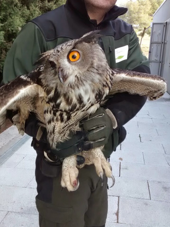 Agentes Medioambientales de Castilla-La Mancha recogieron a un búho real en la provincia de Toledo en estado moribundo, que había perdido un ojo a consecuencia de un disparo. El animal fue trasladado al centro de recuperación de Sevilleja de la Jara, aunque su estado era crítico.